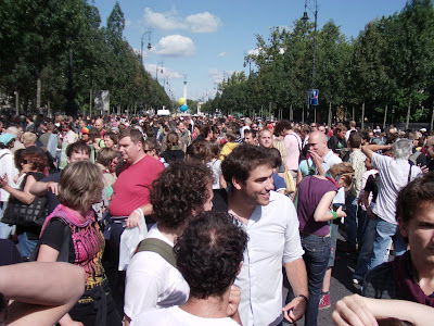 The march stepped off fashionably late. But by 1:30 the ubiquitously unflappable club anthems were booming from huge speakers on the lead truck and we were marching. The crowd had swelled to 2,000 by the time we were a third of the way down the march corridor. I was proud (and relieved) to be marching side-by-side with Juris Lavrikovs of Latvia, and Paata Sabelashvili, of Georgia, two gay men who are on the staff and board (respectively) of ILGA-Europe. In addition to being lovely, committed, sophisticated activists, these guys were also a lot of fun to spend the day with. ILGA-Europe is a tremendously important organization, based in Brussels and providing support to the LGBT movement in Europe.