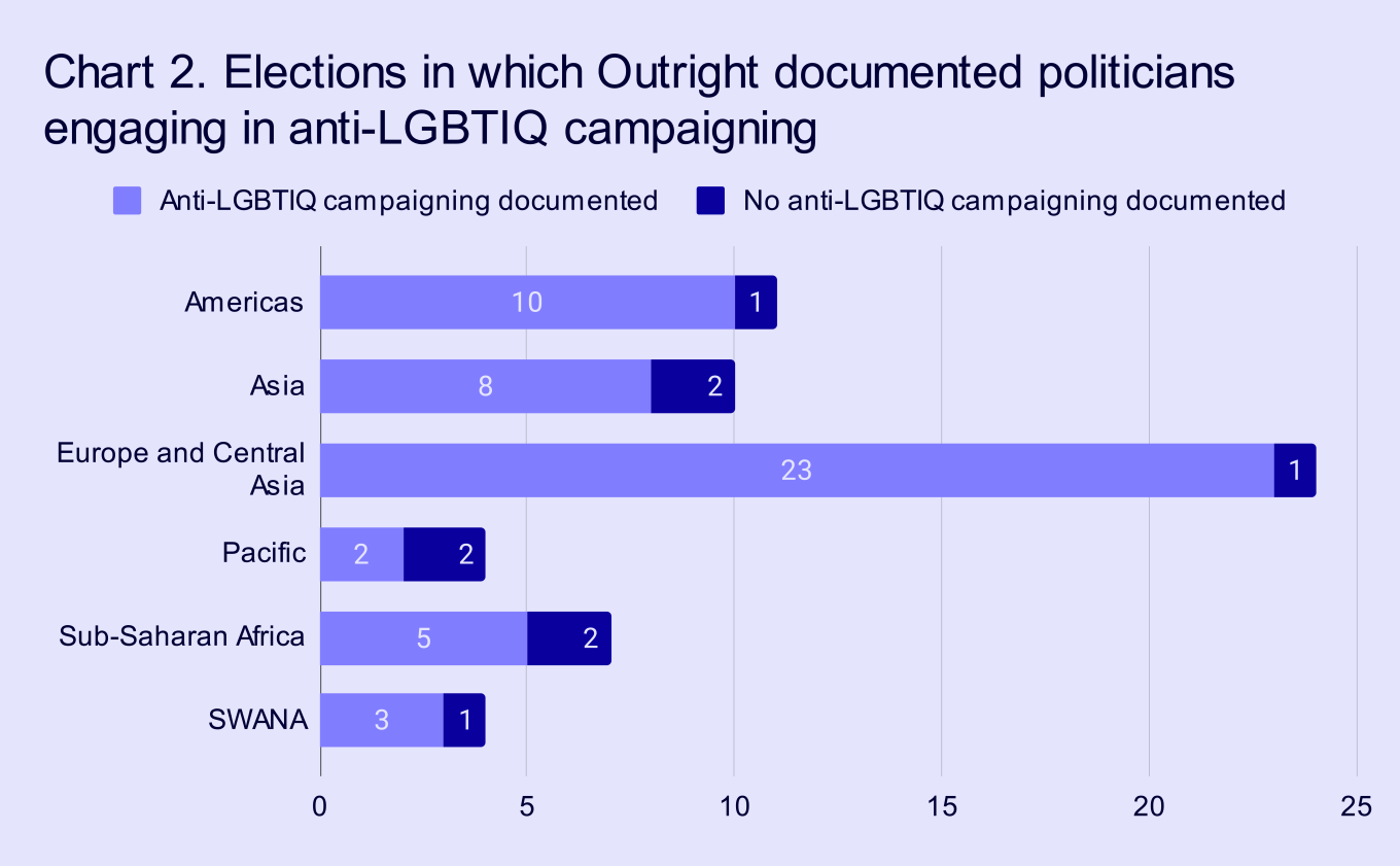 In at least 51 of the 60 countries, political candidates, parties, and groups negatively used LGBTIQ issues in political speech and campaigning, which, in some cases, amounted to hate speech and incitement to violence.